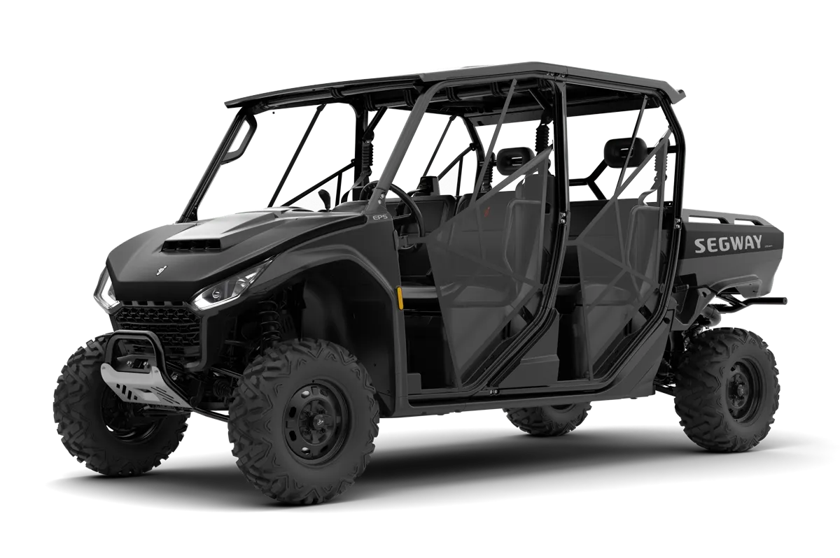 The Segway UT10 Crew is a 6-seat crew utility side-by-side with a 1000cc parallel twin producing 105 HP, 2,500-lb towing, 1,500-lb payload, and a configurable 3-to-6 passenger cabin.